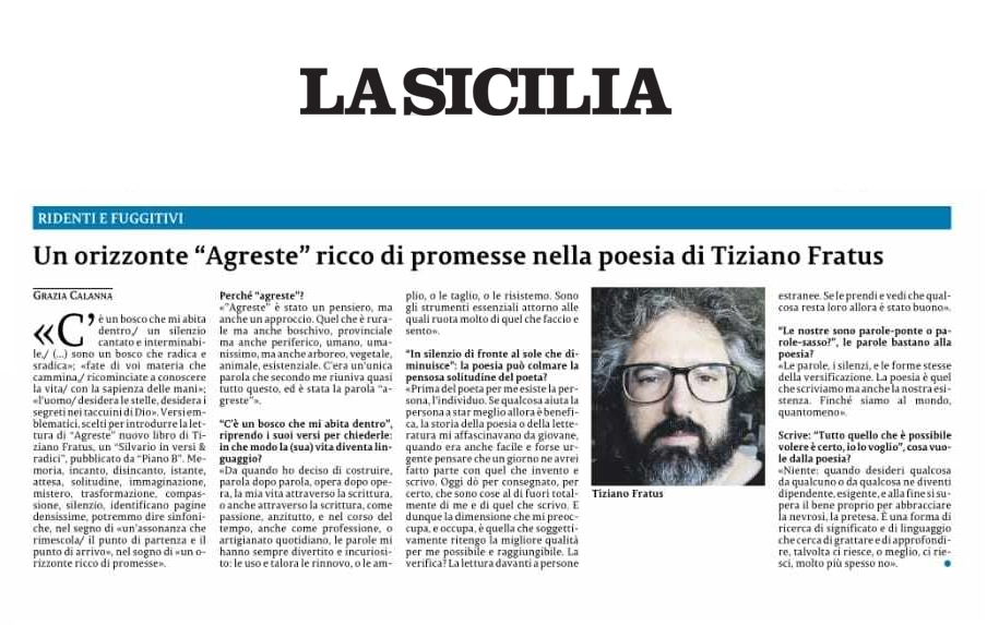 «È sempre rallegrante, se così posso dire, leggere dell’uscita di un nuovo libro di Tiziano Fratus, a mio parere uno degli autori italiani più affascinanti e balsamici da leggere in senso assoluto, e da qualche giorno è in libreria Agreste, il nuovo «Silvario in versi e radici» edito da Piano B Edizioni come il precedente Sutra degli alberi con il quale forma un dittico di rara luminosità letteraria – a partire dalle copertine, entrambe semplicemente bellissime»