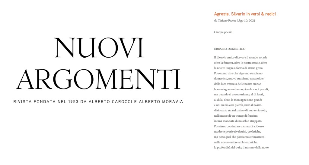 Cinque componimenti da Agreste sono stati accolti e pubblicati in Officina Poesia della storica rivista Nuovi Argomenti, fondata settant’anni fa da Carocci e Moravia. Grazie a Maria Borio. Una buona lettura!