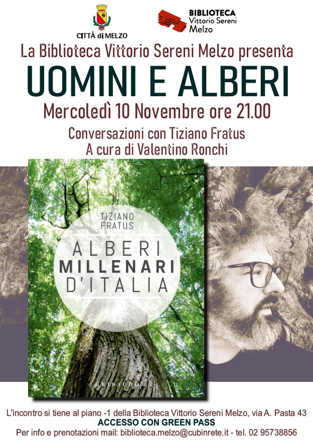 «Ti appassiona la natura? La Biblioteca Vittorio Sereni di Melzo ospita l’evento Uomini e alberi: conversazioni con Tiziano Fratus a cura di Valentino Ronchi. L’appuntamento è fissato per mercoledì 10 novembre alle 21 con Tiziano Fratus, scrittore, fotografo, naturalista e cercatore d’alberi, che unisce alla conoscenza naturalistica una meditazione sul senso della natura. Uomini e alberi è un dialogo con Tiziano Fratus e il suo lento cammino nei boschi e nelle foreste della nostra terra alla scoperta di alberi millenari e di boschi speciali per rigenerarsi e imparare a rispettare la vita vegetale silenziosa che ci circonda» Fuoridalcomune.it