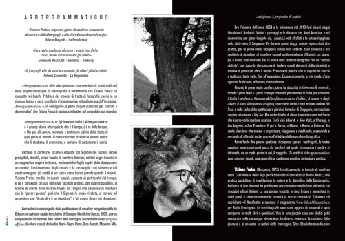 Intorno all’identità del grande albero o dell’albero monumentale è cresciuta, nel corso degli ultimi cinquant’anni, una vera e propria cultura: studi universitari, provvedimenti giurici, azioni, norme, manifestazioni, convegni, tavole rotonde e svariate pubblicazioni. Avendo lavorato per vent’anni sui temi della natura, avendo documentato centinaia di grandi alberi e pubblicato svariati libri dedicati alla monumentalità arborea, a giardini e boschi e foreste e riserve naturali, Tiziano Fratus ha partecipato a diverse tavole rotonde dedicate a questi temi, talora organizzate dal vecchio Corpo Forestale dello Stato, dunque da amministrazioni cittadine e regionali, il CAI e il FAI, orti botanici, enti di gestione di parchi regionali e nazionali, festival e manifestazioni di vario tipo; inoltre Fratus ha guidato camminate alla scoperta del patrimonio arboreo nazionale, ha accompagnato a meditare tra gli alberi e nei giardini, ha tenuto personali fotografiche.