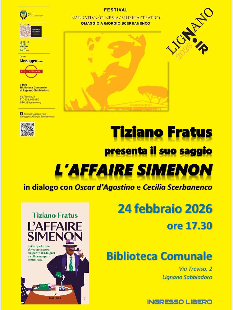 Martedì 24 febbraio, Biblioteca comunale, Lignano Noir, ore 17.30 – Presentazione de L’Affaire Simenon, l’autore dialoga con Oscar D’Agostino e Cecilia Scerbanenco