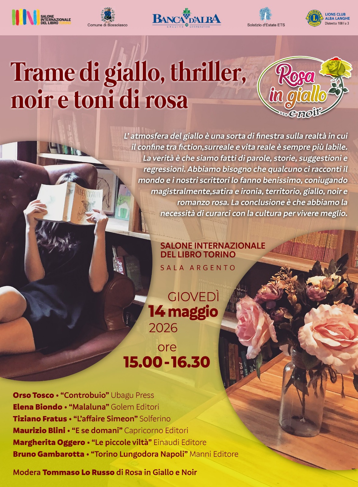 Giovedì 14 maggio, Lingotto Fiere, Sala Argento, ore 15.00 – Trame di giallo, thriller, noire note di rosa, intervengono tra gli altri Orso Tosco, Elena Biondo, Bruno Gambarotta, Margherita Oggero, Maurizio Blini e Tiziano Fratus, modera Tommaso Lo Russo