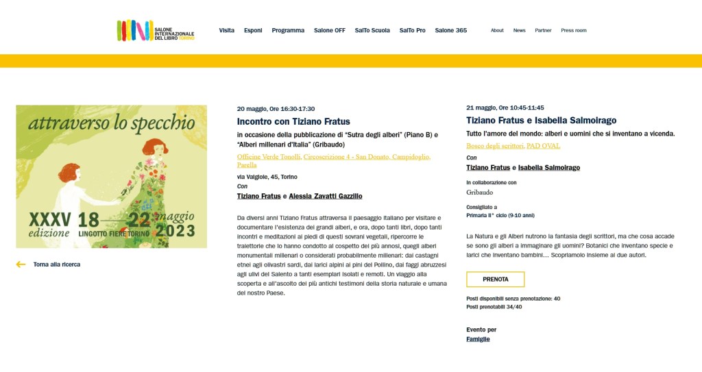 Tiziano Fratus è ospite al Salone del Libro con due incontri: il primo rientra nella programmazione del Salone Off, sabato 20, ore 16.30, alle Officina Verde Tonolli, presentazione dei silvari Alberi millenari d’Italia (Gribaudo) e Sutra degli alberi (Piano B), l’autore dialoga con Alessia Gazzillo Zavatti, in collaborazione con la libreria Diorama Kids; il secondo incontro avrà luogo domenica 21, ore 10.45, presso Il Bosco degli Scrittori / Spazio Aboca: Tutto l’amore del mondo: alberi e uomini che si inventano a vicenda, incontro-dialogo tra Tiziano Fratus e Isabella Salmoirago, presentazione del Manuale per giovani inventori di alberi e foreste e del romanzo Il re del bosco (Idee Feltrinelli & Gribaudo).
