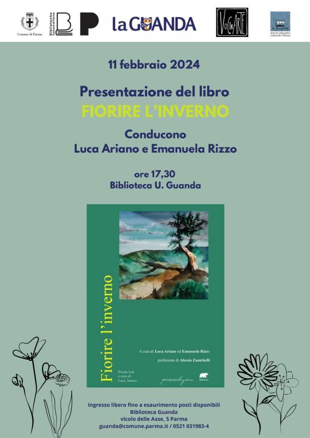 Presentazione in anteprima dell’antologia Fiorire l’inverno (Bertoni editore), a cura dei poeti Luca Ariano e Emanuela Rizzo. Lettura dei poeti partecipanti, tra i quali Joan Josep Barcelò, Giancarlo Baroni, Marilyne Bertoncini, Hsiu-Chen Chen, Tiziano Fratus, Gabriel Grossi, Kuei-Shien Lee, Alma Saporito, Maria Pia Quintavalla, Sofia Skleida e altri.
