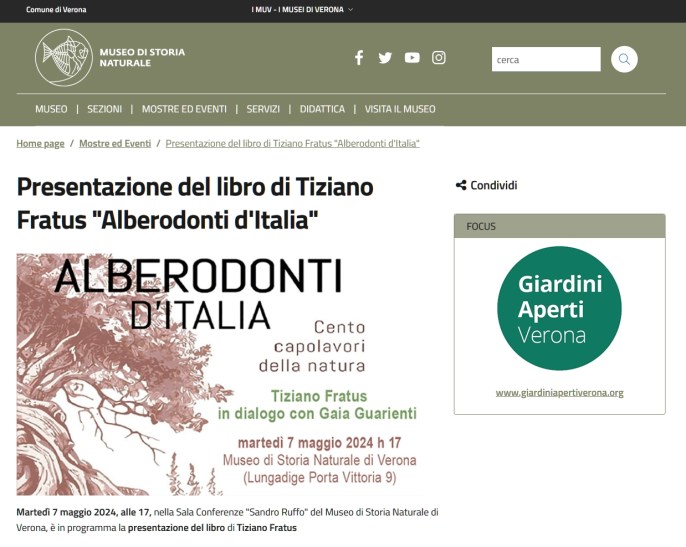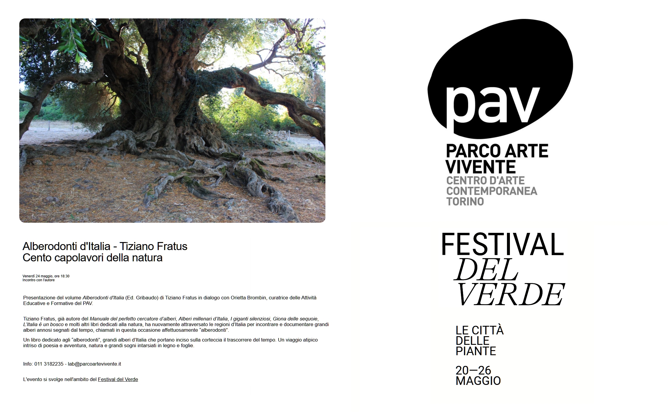 >>> https://www.eventbrite.it/e/nella-foresta-dei-padri-e-delle-madri-tickets-973706120217 >>> https://www.festivaletteratura.it/en/2024/events/6-alberi-che-hanno-visto-la-storia-4287 >>> https://www.gribaudo.it/appuntamenti/2024/07/11/tiziano-fratus-presenta-alberodonti-ditalia-al-festivaletteratura-di-mantova/ >>> https://www.festivaletteratura.it/it/mantova/altri-eventi-in-citta