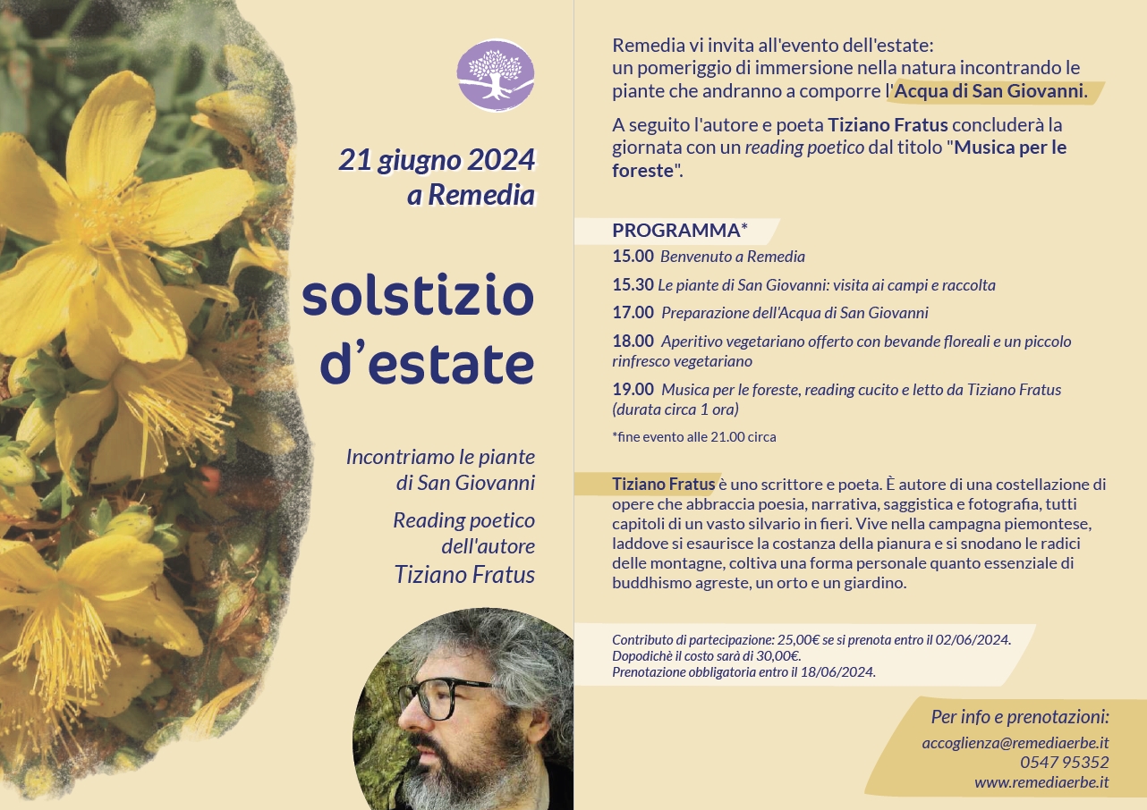Tiziano Fratus partecipa al Festival Foresta Maestra, presso la Basilica di Santa Trinita: ore 11.00, La Foresta Metropolitana, incontro tra autori delle edizioni Aboca, Stefano Bartolini, Tiziano Fratus ed Erika Maderna, introduce Massimo Mercati; ore 19.00, Fratus parteciperà all’ottava edizione del festival estivo organizzato da La nottola di Minerva, Felicità Metropolitane: presso il Giardino dell’Anconella Filosofia del Grande Albero, Tiziano Fratus presenta Alberodonti d’Italia (IF Gribaudo) e Sutra degli alberi (Piano B) in dialogo con Mariella Zoppi.