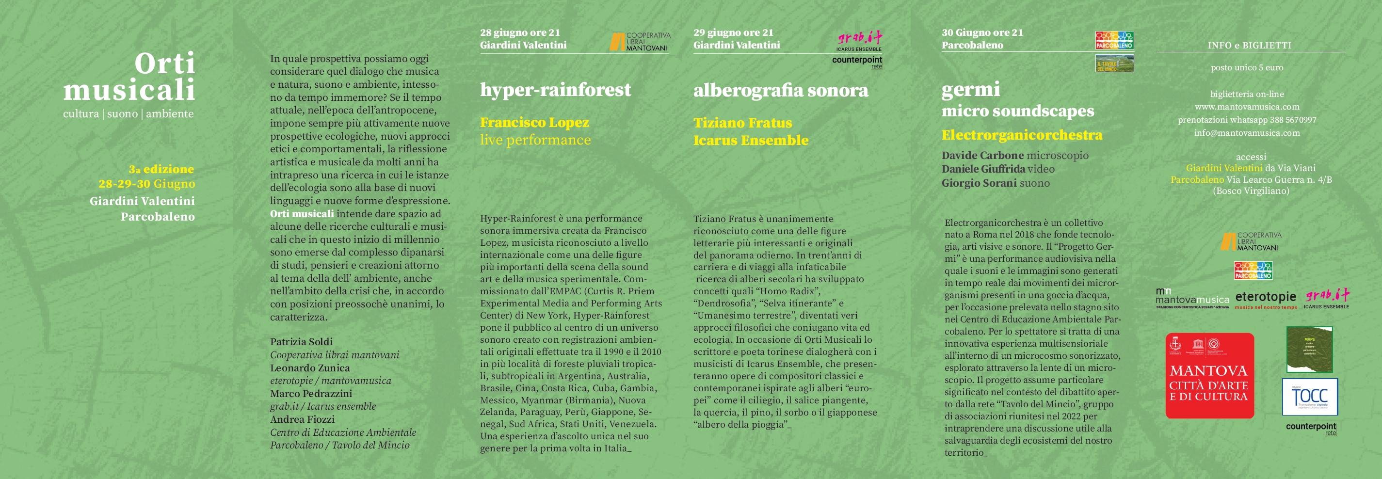 Il bosco dei poeti – Radici, proiezioni, segreti, evidenze, fisicità, attese e cambiamenti, resilienze e mutamenti repentini. Come quattro alberi quattro voci appartenenti a diverse generazioni dialogano partendo dal proprio abitare il tempo e la scrittura. Partecipano con letture dalle ultime opere Tiziano Fratus (Agreste, Piano B), Luca Ragagnin (Un solco senza seme, Miraggi), Silvia Rosa (Tutta la terra che ci resta, Vydia) e Valeria Rossella (Quello che vedo, Interlinea).