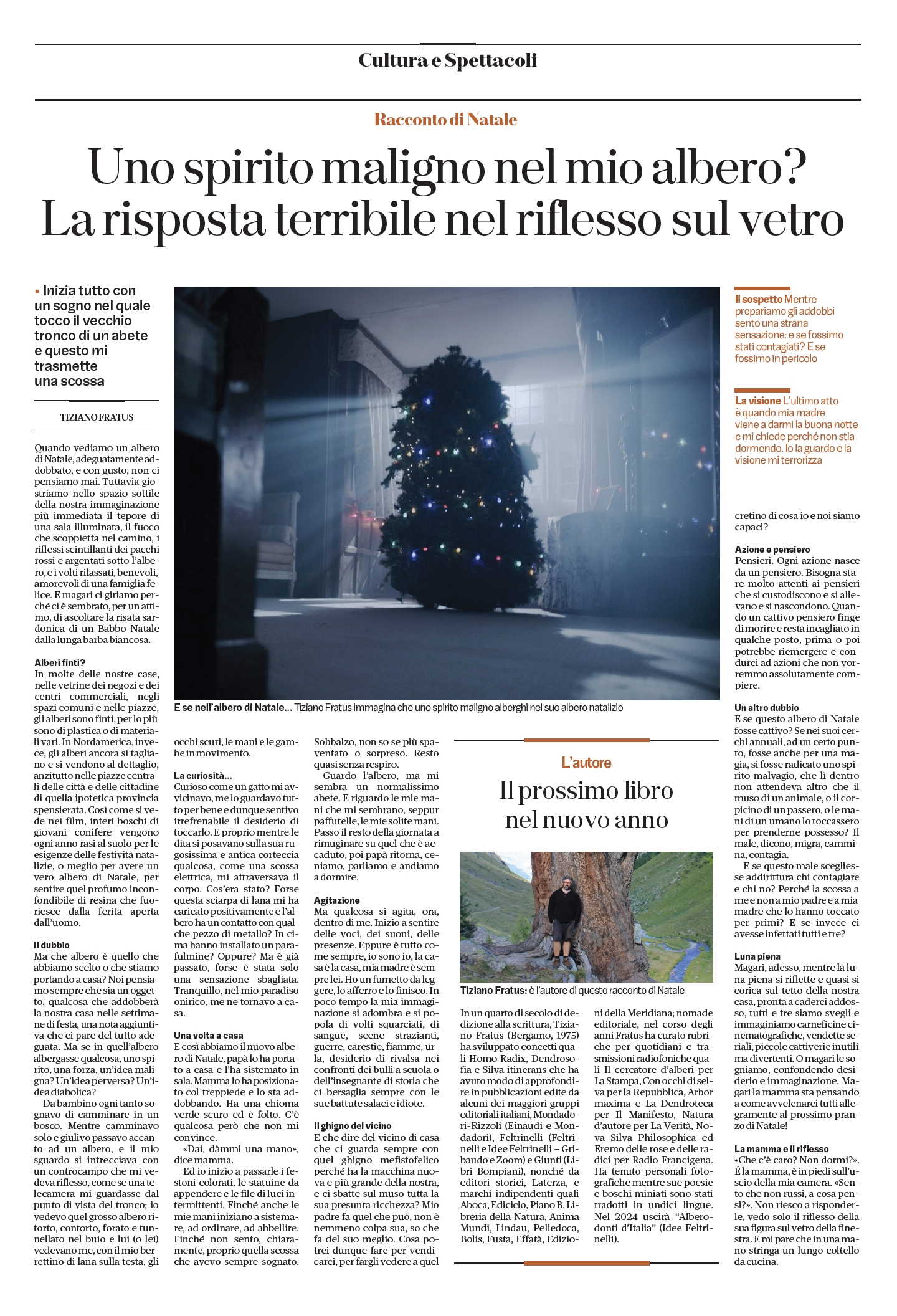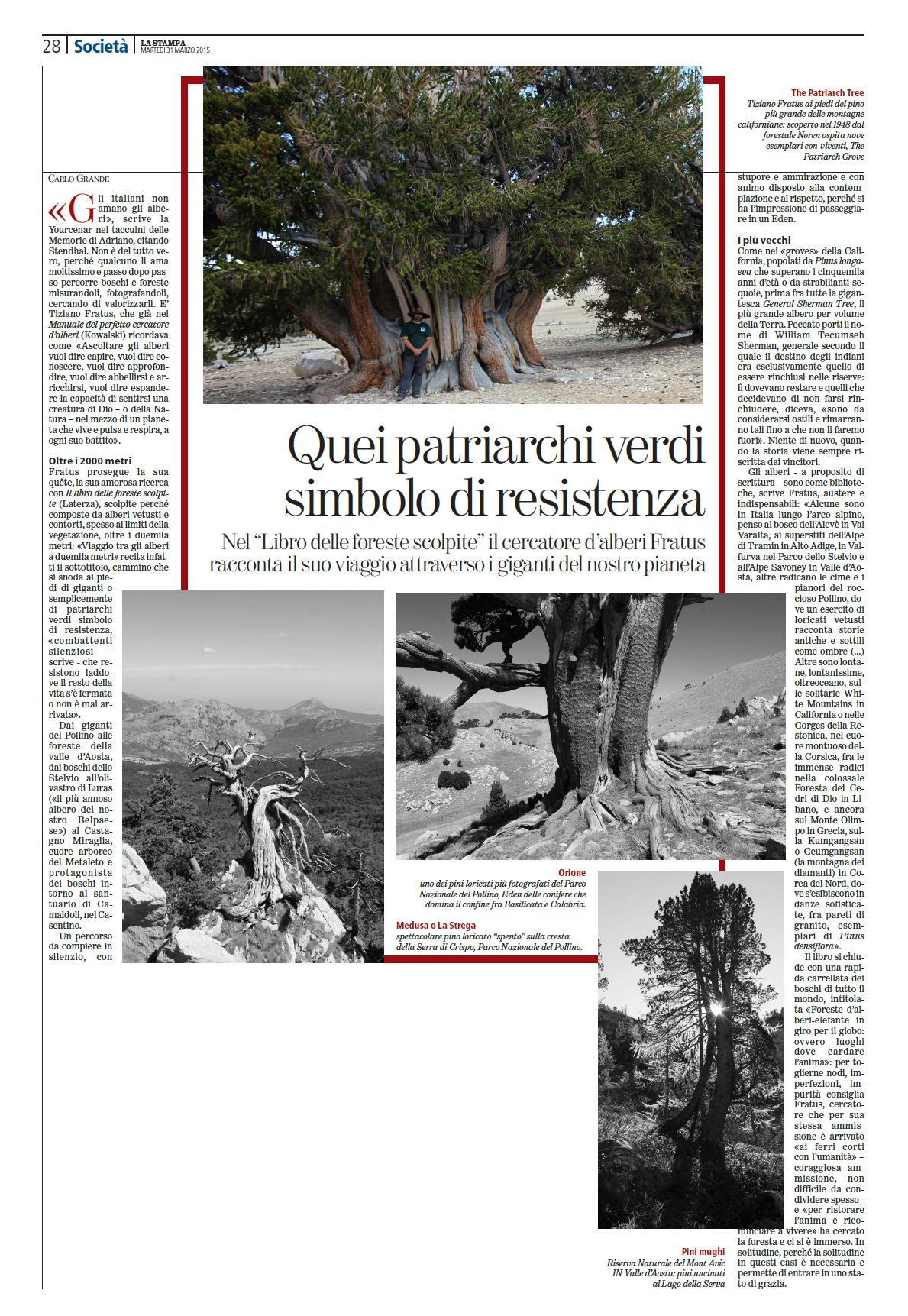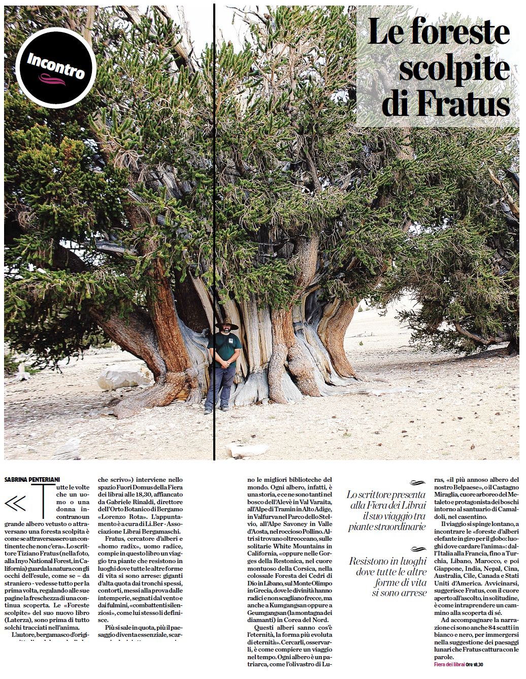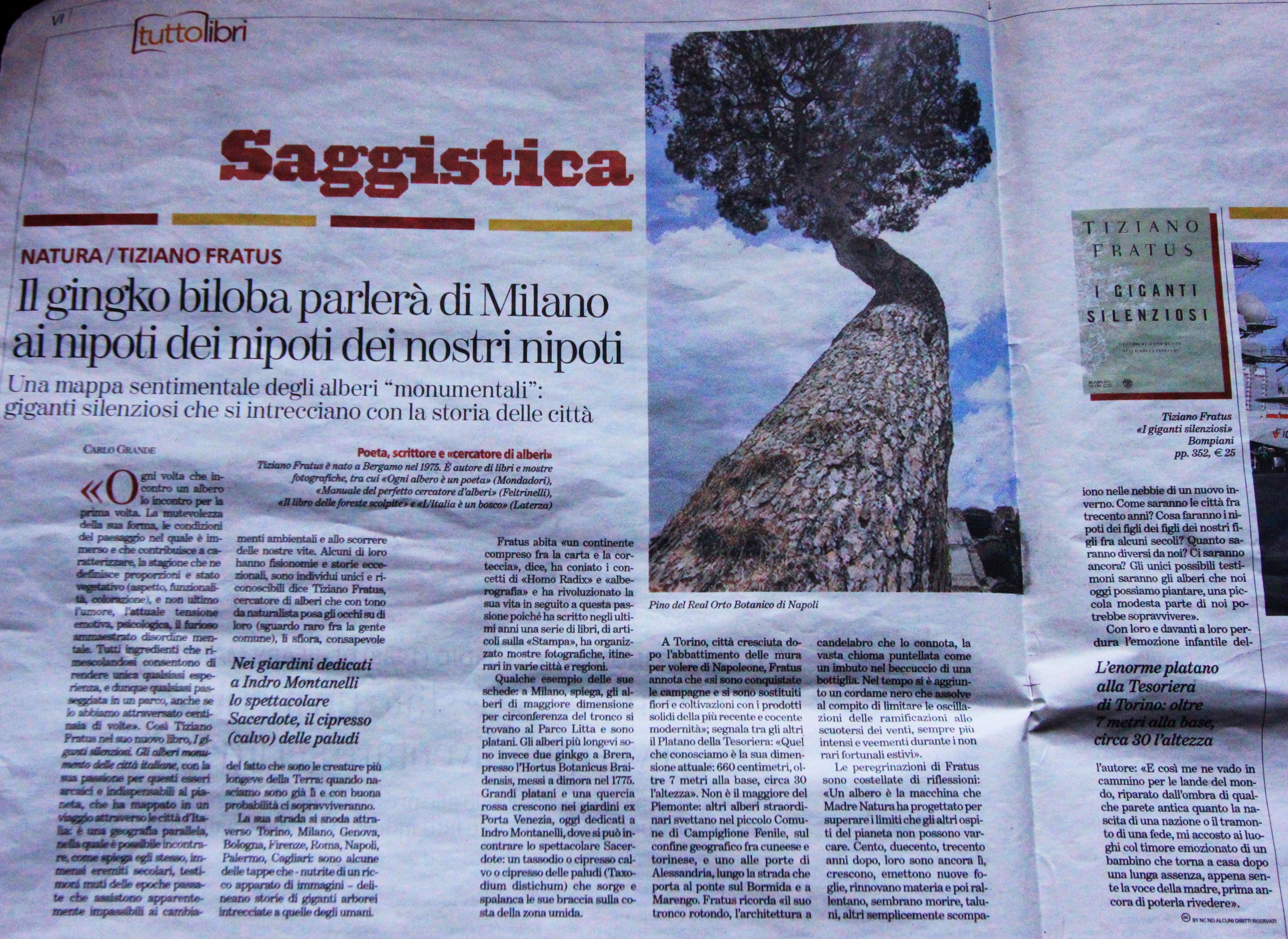 >>> Ecoletture | Eco, leggi Un pensiero che cammina: lo scrittore che narra gli alberi | La Repubblica, leggi Il giro d’Italia lungo i Grandi Alberi e Un Homo Radix che ha attecchito nelle librerie e Nel mondo agreste e I pilastri della terra | Il Corriere della Sera, leggi Il Collezionista di Alberi e Ufficio Poesie Smarrite e L’inventore di alberi | Tuttolibri, leggi Venite a camminare nei boschi e Abbracciamo gli alberi e Il ginkgo biloba parlerà di Milano ai… | La Stampa, leggi Quei patriarchi verdi simbolo di resistenza e I matusalemme della terra e L’uomo che cerca l’anima degli alberi e Grand Tour tra gli alberi e La sequoia di Vicoforte cittadina onoraria | Il Manifesto, leggi Nelle radici viventi del tempo e Camminando tra creature arboree e Il bosco dei mille anni | De Agostini Scuola, leggi Tiziano Fratus, il cercatore di alberi | Terra Incognita, leggi Libri sugli alberi e sulla natura | Donna Moderna, leggi Toglietemi tutto tranne gli alberi e In compagnia di un albero millenario | Panorama, leggi Definizione di bianco lepre | Doppiozero, leggi Gli alberi e le parole di Tiziano Fratus | Il Giornale, leggi Se gli scrittori sentono il richiamo della foresta | L’Avvenire, leggi Quando Dio ci fa stupire nelle sequoie | Elle, leggi Mille miliardi di alberi | L’Eco di Bergamo, leggi Impariamo insieme come è possibile ascoltare le foreste e Le foreste scolpite di Fratus e In un mondo sradicato ho imparato ad amare gli alberi | Giornale di Brescia, leggi Tutelare grandi alberi e foreste vale come un comandamento| Gazzetta di Mantova, leggi Uno spirito nel mio albero | Corriere del Ticino, leggi Ad un certo punto ho deciso che mi sarei inforestato | Friuli Sera, leggi Intervista all’Uomo Radice | L’Adige, leggi Il selvaggio movimento vegetale e Sequoie | Domani, leggi Trasformare le città in foreste non è una soluzione | Piemonte Parchi, leggi La poetica dell’Uomo radice | Green & Blue, leggi Non basta più salvare alberi e Metteremo i cactus giganti in Piazza Duomo? | Natural Style, leggi A modo mio sono un eremita anch’io e Meditazione sul foliage | Il Dolomiti, leggi Fratus, il cercatore d’alberi che riesce a cogliere… | Il Trentino, leggi Il Poeta della Natura | Zest Letteratura Sostenibile, leggi interviste e articoli | Tellus, Speciale Ecopoesia | La Gazzetta del Mezzogiorno, leggi L’Italia è un bosco | La Sicilia, leggi Una passeggiata dendrosofica sull’Etna e Il tessitore di foreste e Un orizzonte Agreste | Unione Sarda, leggi T.F. e il mondo dei boschi | La Gazzetta del Sud, leggi Alberi, palestre di bellezza | QN, leggi La lezione del cercatore di alberi, intervista a Il cercatore di alberi