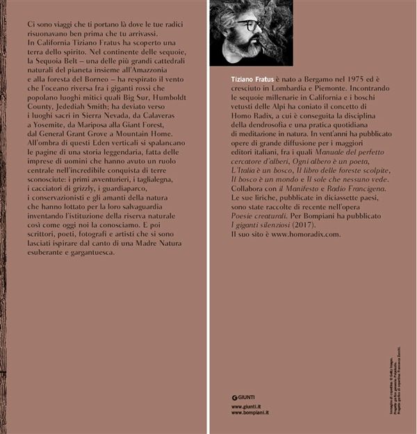 Ci sono viaggi che ti portano là dove le tue radici risuonavano ben prima che tu arrivassi. In California Tiziano Fratus ha scoperto una terra dello spirito. Nel continente delle sequoie, la Sequoia Belt – una delle più grandi cattedrali naturali del pianeta insieme all’Amazzonia e alla foresta del Borneo – ha respirato il vento che l’oceano riversa tra i giganti rossi che popolano luoghi mitici quali Big Sur, Humboldt County, Jedediah Smith; ha deviato verso i luoghi sacri in Sierra Nevada, da Calaveras a Yosemite, da Mariposa alla Giant Forest, dal General Grant Grove a Montain Home. All’ombra di questi Eden verticali si spalancano le pagine di una storia leggendaria, fatta dalle imprese di uomini che hanno avuto un ruolo centrale nell’incredibile conquista di terre sconosciute: i primi avventurieri, i taglialegna, i cacciatori di grizzly, i guardiaparco, i conservazionisti e gli amanti della natura che hanno lottato per la loro salvaguardia inventando l’istituzione della riserva naturale così come oggi noi la conosciamo. E poi scrittori, poeti, fotografi e artisti che si sono lasciati ispirare dal canto di una Madre Natura esuberante e gargantuesca.