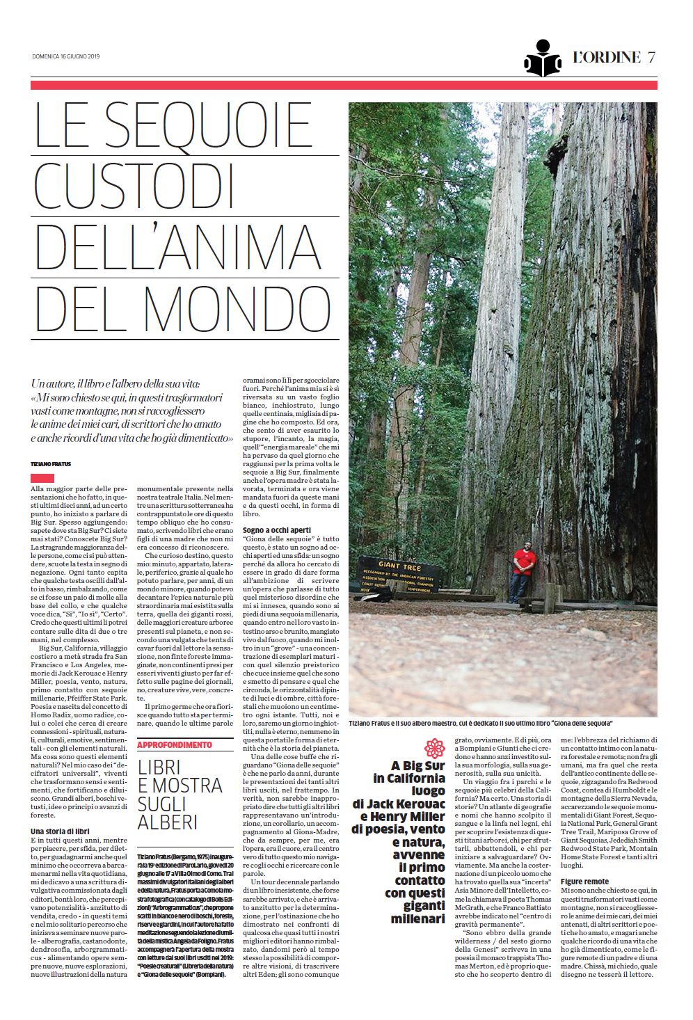 E’ uscito domenica 25 agosto lo speciale Viaggi d’autore del settimanale °L’Ordine°, inserto culturale dei quotidiani La Provincia di Como e La Provincia di Sondrio. Otto viaggi memoriabili per otto poeti e autori. Fra le voci Tiziano Fratus che ha descritto una visita alla Giant Forest: California, abitano qui i giganti del mondo – Nel Sequoia National Park ci si trova proiettati in una realtà sovrumana. Ogni monumento verde nasconde una storia: dietro il più grande si cela una comunità utopistica che per tre anni lo ribattezzò Karl Marx. Gli altri scrittori sono Maurizio Cucchi, Gianni Biondillo, Flavio Santi, Luigi Nacci, Tino Mantarro, Mattia Conti e