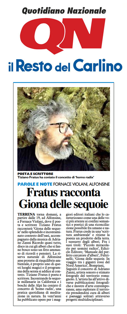 «Terrena torna domani, a partire dalle ore 19, ad Alfonsine, a Fornace Violani, dove il poeta e scrittore Tiziano Fratus racconterà Giona delle sequoie nello splendido e incontaminato contesto dell’oasi […] Incontrando le sequoie millenarie in California e i boschi delle alpi ha coniato il concetto di Homo radix» Il Resto del Carlino