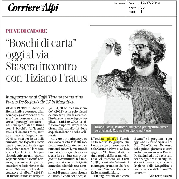 «Tiziano Fratus torna nel Bellunese, questa volta ospite della manifestazione Boschi di Carta, a Pieve di Cadore […] Sarà presentata al pubblico la nuova opera, Giona delle sequoie» Il Gazzettino