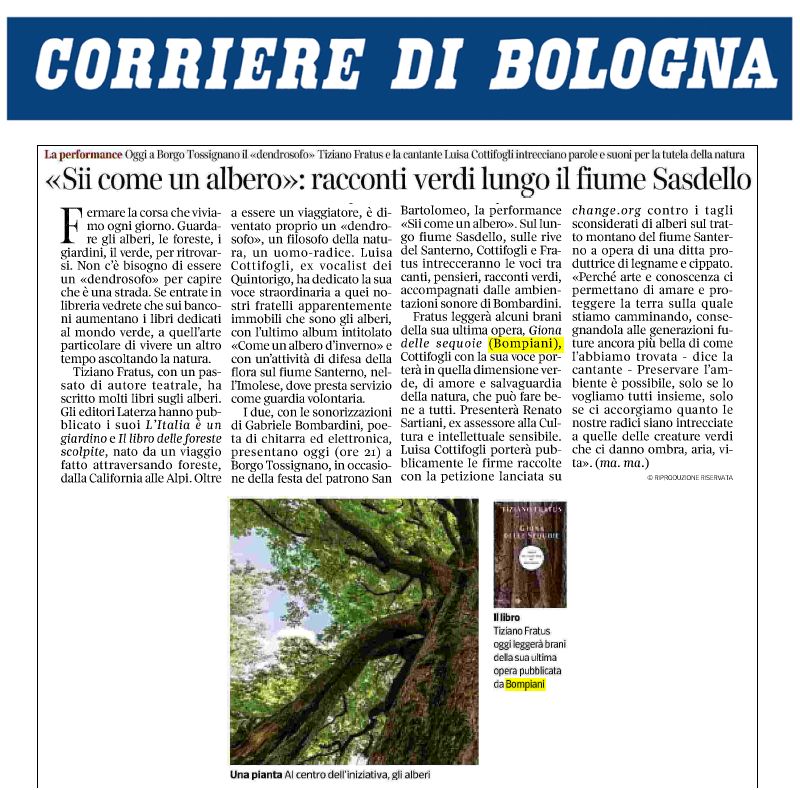 «Sul lungo fiume Sasdello, sulle rive del Santerno, le voci di due artisti del calibro di Tiziano Fratus e Luisa Cottifogli si intrecceranno liberamente fra racconti verdi e suggestioni vocali, accompagnate dalle ambientazioni sonore del chitarrista Gabriele Bombardini. In caso di maltempo l’evento si terrà presso la Sala Consiliare del Comune. Un incontro fra l’arte della parola e quella del suono, per gli alberi e in mezzo a loro, metafore viventi di ciò che anche l’essere umano dovrebbe essere: Sii come un albero [….] Tiziano Fratus, scrittore-filosofo, “dendrosofo”, l’uomo-radice che ha scritto innumerevoli libri sugli alberi per le più importanti case editrici italiane, che alterna prosa a poesia e meditazione nella natura, leggerà alcuni passi dalla sua ultima opera letteraria Giona delle sequoie (Bompiani).» Roberto Di Biase – Emilia Romagna News