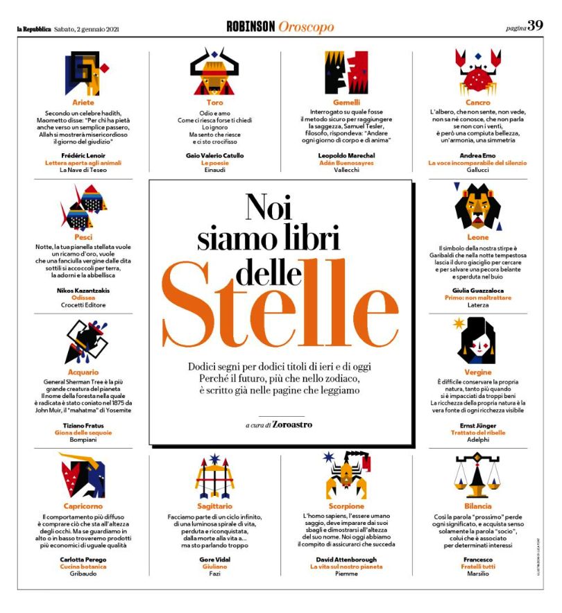 Gennaio 2021 – L’inserto letterario e culturale del quotidiano La Repubblica, Robinson, ha segnalato Giona delle sequoie in un articolo dal titolo Noi siamo libri delle stelle – Dodici segni per dodici titoli di ieri e di oggi, a cura di Zoroastro. Il silvario di Fratus è in compagnia di grandi autori quali Catullo, Junger, Gore Vidal, Papa Francesco, Lenoir, il filosofo Andrea Emo e il poeta Kazantzakis.