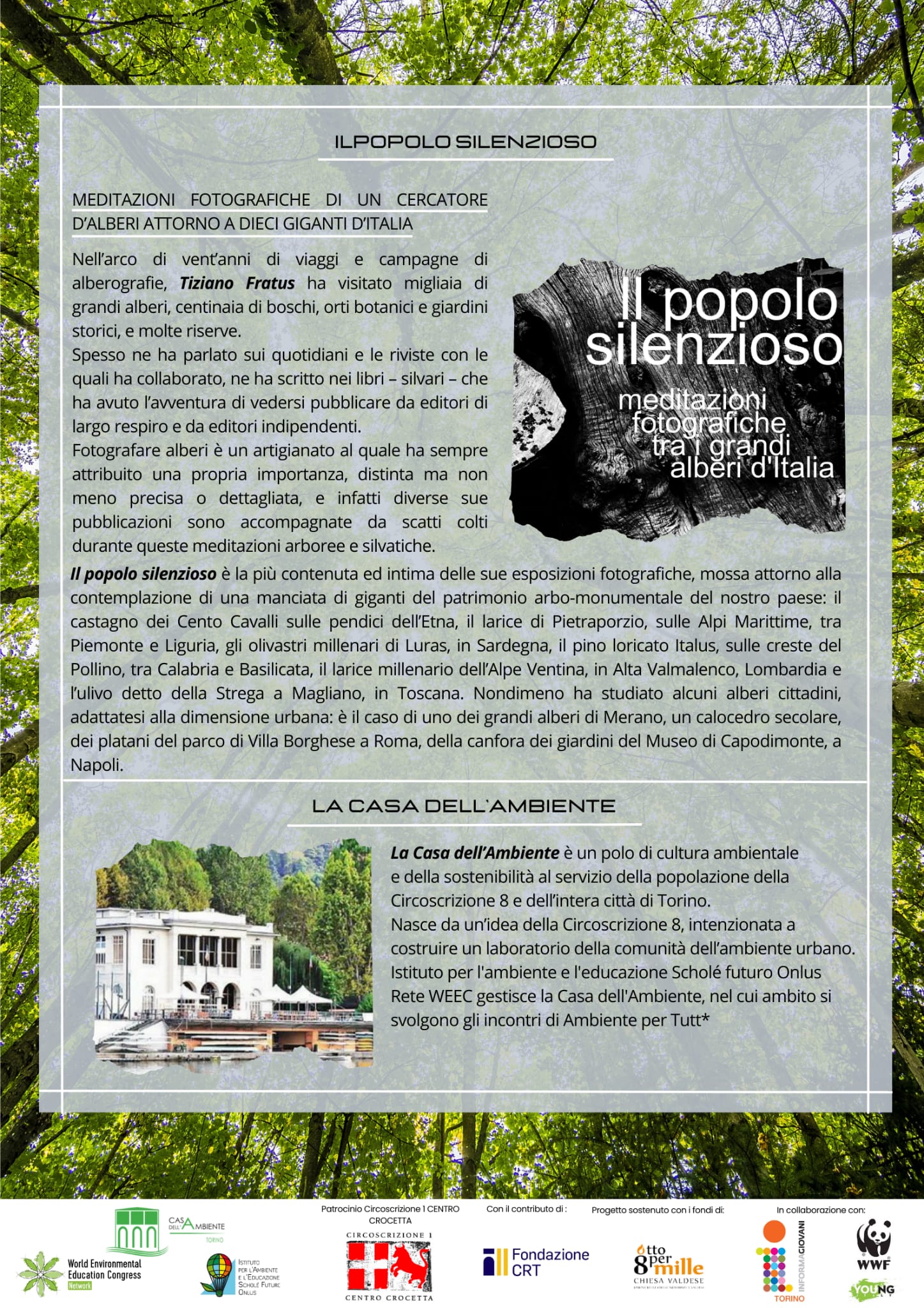 Il popolo silenzioso è la più contenuta ed intima delle esposizioni fotografichedi Tiziano Fratus, dedicata alla contemplazione di una manciata di giganti del patrimonio arbo-monumentale del nostro paese: il castagno dei Cento Cavalli sulle pendici dell’Etna, il larice di Pietraporzio sulle Alpi Marittime, tra Piemonte e Liguria, il pino loricato Italus sulle creste del Pollino, il larice millenario dell’Alpe Ventina in Alta Valmalenco, il faggio del Pontone, simbolo del Parco Nazionale d’Abruzzo, alcuni ulivi e olivastri (quali gli esemplari millenari di Luras e Sa Reina a Villamassargia in Sardegna, l’ulivo detto della Strega a Magliano in Toscana, la costellazione di grandi ulivi della Piana di Ostuni, in Salento). Nondimeno Fratus ha studiato alcuni alberi cittadini, adattatisi alla dimensione urbana: è il caso di uno di uno dei grandi alberi di Merano, un calocedro secolare, dei platani orientali del Parco di Villa Borghesea Roma, della canfora dei giardini del Museo di Capodimonte a Napoli.
