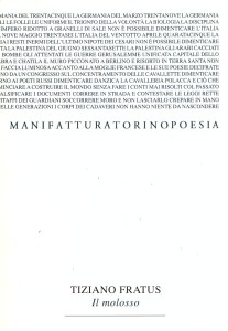 Fratus ha sposato l’idea di un’anima che lotti con ogni forma di esistenza, declinando una scrittura poetica onnivora, capace di fare i conti coi desideri, la sessualità, la storia, la quotidianità, il ricordo, l’immaginazione, il dolore, le epifanie e molto altro ancora. Il Molosso è un poema diviso in due parti, Libro bianco e Libro nero, e composto di 52 canti o “bocche”, divise ciascuna in un numero variabile di scene o “picta”.