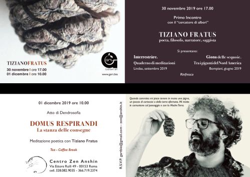 Letture e presentazioni a pioggia nel mese di novembre. Fra gli appuntamenti si segnalano in Piemonte: Cercare le nostre radici nella natura (sabato 9, Avigliana), Autunno fruttuoso (domenica 10, Cartosio), Parco del Valentino (sabato 16, Torino), Giornata Nazionale dell’Albero (giovedì 21, Pinerolo); Fratus sarà a Milano e a Roma invece nei giorni 28 e 30, in occasione di due eventi presso la sede della Regione Lombardia e il Centro Zen Anshin.