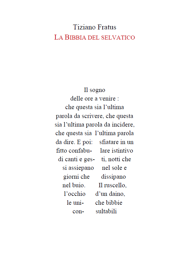 Questa poesia ha avuto diversi titoli. In Poesie creaturali è stata intitolata Settima distinzione e sigillava un ciclo di componimenti dedicato a Santa Rosa, mistica viterbese vissuta nella prima metà del tredicesimo secolo. Qui viene presentata con un nuovo titolo, La Bibbia del selvatico. Buona lettura.