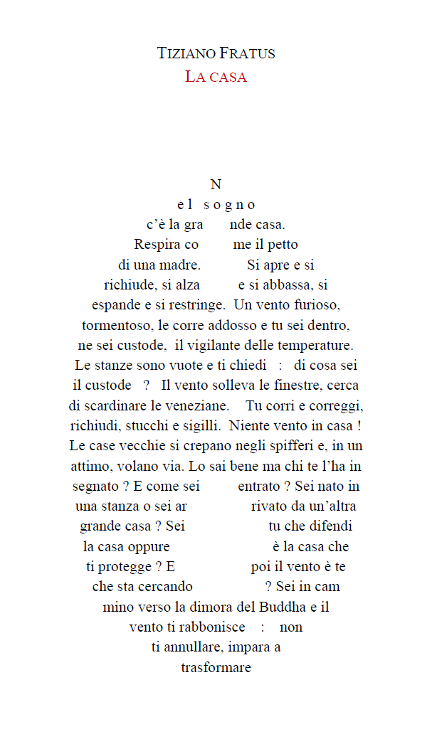 Il vento della vita ci sbatte addosso, ci scuote, ci mette in allarme, ci preoccupa. Anche quando non lo sentiamo, sapendo che prima o poi tornerà, ci inquieta, ci può condizionare o addirittura paralizzare. Ripariamo nella casa ma che rapporto esiste fra noi e la casa? La casa è una poesia buddista ed enigmatica di Tiziano Fratus, parte di un corpus di poesie dal titolo I corpi cavi. La versione a seguire è aggiornata all’estate 2020, si discosta leggermente rispetto alla poesia pubblicata nel volume Interrestràre.
