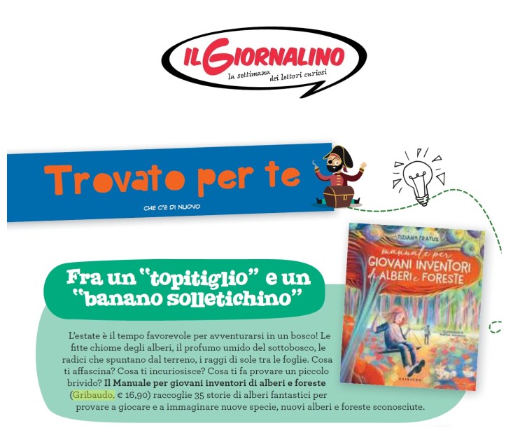 «Trentacinque alberi nati dall’estro di Tiziano Fratus, che da sempre osserva le foreste e cerca di capire che cosa pensano gli abitanti dei boschi, sono il cuore del Manuale per giovani inventori di alberi e foreste (Gribaudo, illustrazioni di Martina Andonova). Autore generoso – ha scritto quaranta titoli di poesia, viaggio, oltre a saggi e romanzi – Fratus invita i ragazzi e le loro famiglie a immergersi in un mondo popolato da creature silvestri divertenti e curiose. Si potrà fare amicizia con il Querciacero, o albero delle chiacchiere e dei pettogoli perché ama crescere accanto a panchine dove le persone parlano senza sosta, il Topitiglio, un albero triste che cresce soprattutto nei terreni inquinati o l’Acaciacottera che sprigiona un profumo capace di far innamorare. Fantasiose schede botaniche e simpatici racconti in cui fa capolino la presenza umana permettono di scatenare la fantasia e provare noi stessi a reinventare ogni volta il nostro mondo» TuttoMilano, La Repubblica