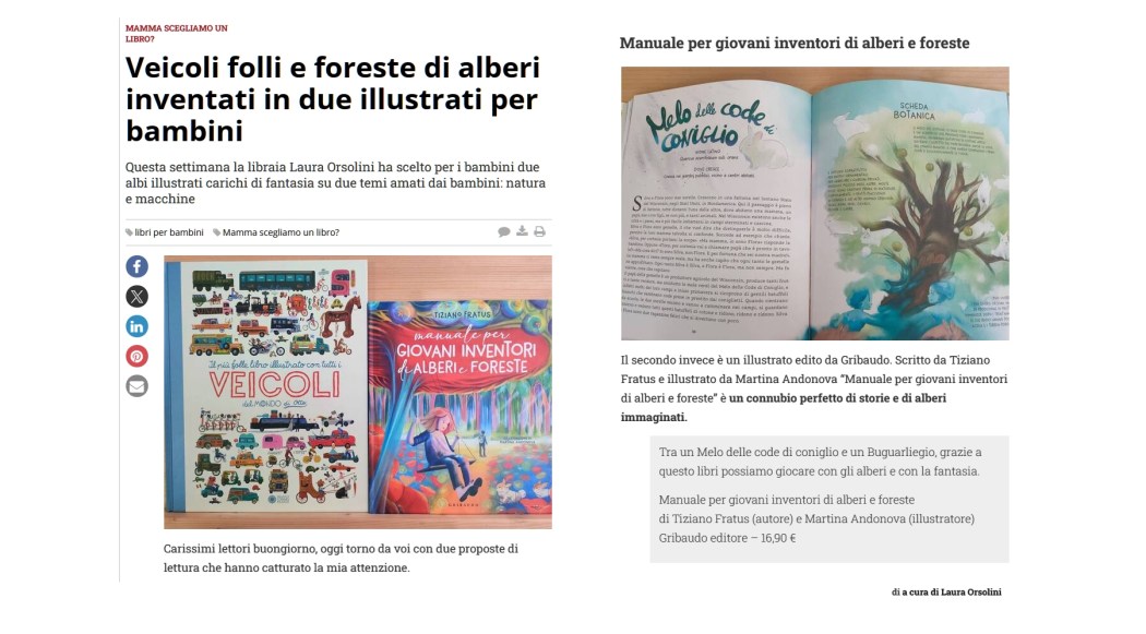«Chi conosce il bugiarliegio? E il topitiglio? Ci sono il banano solletichino e il cervoabete in amore, il talpalarice e il fagatto miagoloso. Si creano nomi e si piantano boschi in questo albo firmato Tiziano Fratus dal titolo Giovani inventori di alberi e foreste. Un albo illustrato da Martina Andonova che permette ai giovani lettori di giocare con le piante, di immaginare nuove specie, di capire come un albero trova il proprio nome» La Lettura, Corriere della Sera
