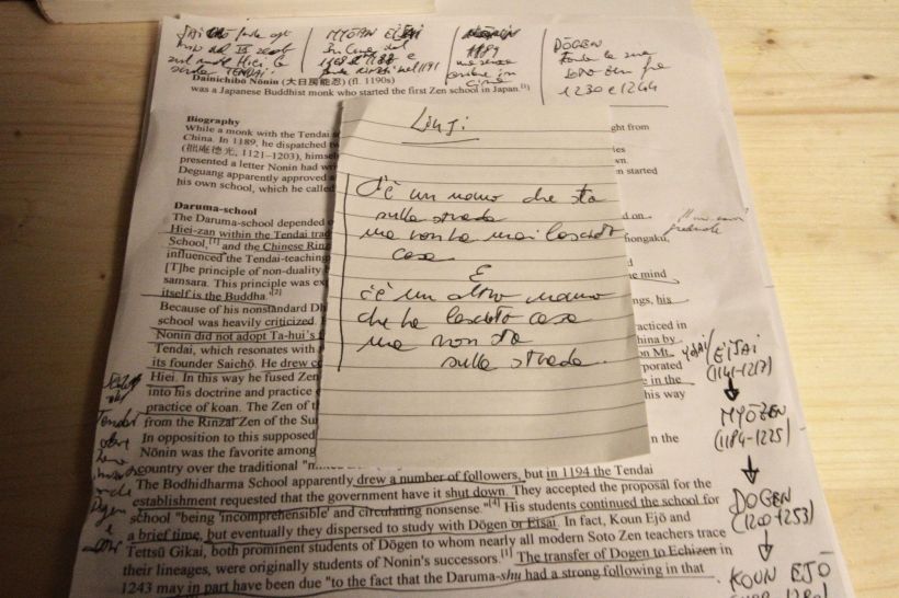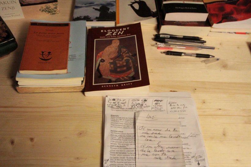 Lungo il percorso di meditazione e raccogliemento sono sbocciati il concetto di Bosco itinerante, espresso in una poesia che potete leggere fra le radici per un ritratto in versi, la semina di un minuscolo eremitaggio, Ne-an (Eremo delle radici) e gli incontri dell’Orchestra dei semi e delle radici / I tessitori di foreste. Il percorso del buddismo e del buddismo zen è costantemente in dialogo con gli alberi e il bosco, come dimostrano episodi ed idee percorse da figura capitali, quali Siddharta Gautama, Bodhidharma, Shishuang Qingzhu, Hongzhi Zhengjue, Tiantong Rujing, e pratiche quali l’”illuminazione silenziosa”, radice della meditazione poi perfezionata da Dogen e dalla scuola Soto Zen. Si legga qui un articolo relativo di approfondimento: