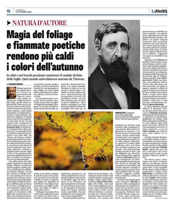 Tiziano Fratus collabora col quotidiano La Verità, la sua rubrica domenicale s’intitola Natura d’Autore. Inizialmente si è trattato di una serie di otto racconti dal titolo Storie innaturali, quindi la serie Alberi d’Italia, dedicata ai grandi alberi monumentali, poi storie tra racconto e natura e recensioni di libri, interviste ad autori, poeti, viaggiatori e artisti e attualmente meditazioni e riflessioni. Una buona lettura!