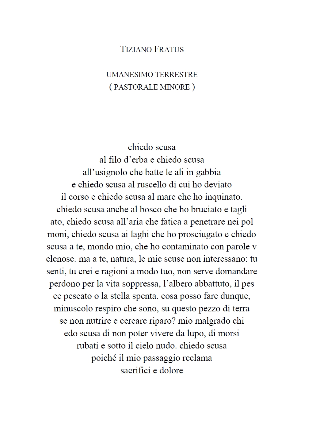 Pastorale minore è un componimento di chiara ispirazione francescana e buddista, o meglio una meditazione che nasce tra i boschi e si ispira ai temi cari al poverello di Assisi quanto di diversi monaci ed eremiti della tradizione buddista. E’ al contempo una contemporanea constatazione scientifica ed ambientale, o meglio un’ammissione, un breve monologo confessionale che tenta di dipingere tutto quel che l’uomo – la specie umana ma anche ciascuno di noi, nel proprio piccolo – fa al Pianeta Terra soltanto vivendo ed evolvendosi/devolvendosi. Resta alla fine un “non so bene che cosa poter fare di diverso”, poiché i cambiamenti radicali sono ben facili da proclamare e promettere ma tutt’altro da vivere e realizzare. Buon ascolto e buona lettura.
