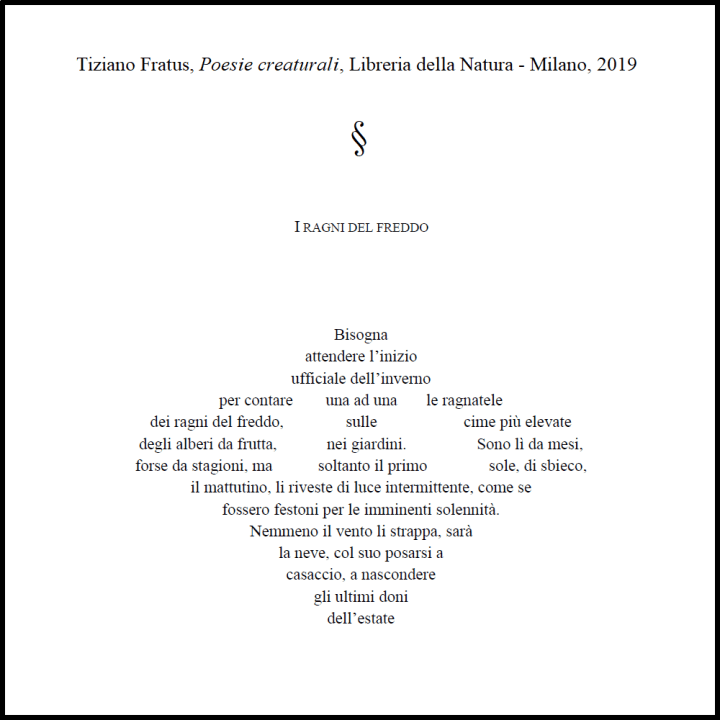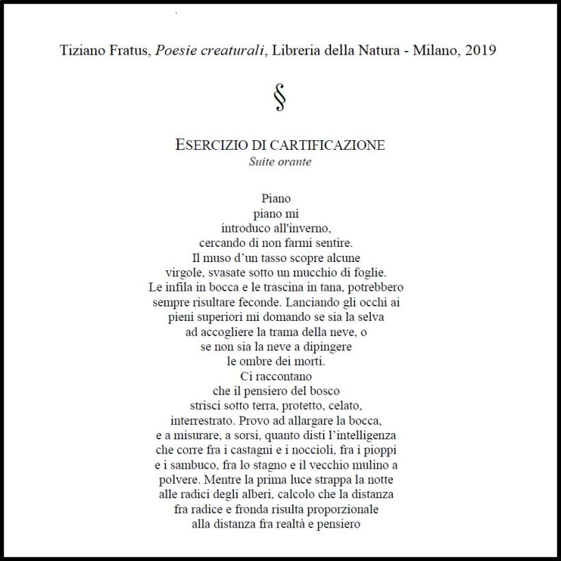 «Dato che lo scorso 21 marzo è stata celebrata la Giornata Mondiale della Poesia, e siccome ho apertamente dichiarato cosa penso, personalmente, di tali celebrazioni, ora dico anche che, ad esempio, un libro come Poesie Creaturali di Tiziano Fratus è di quelli che consente di celebrare sempre la poesia, come dovrebbe essere a prescindere da qualsiasi “Giornata”. Perché la poesia è l’arte letteraria assoluta per eccellenza, dunque non può confinarsi in limiti di tempo o di spazio (che non sia quello, ovviamente funzionale, della pagina e del libro), e perché quelle di Fratus sono “composizioni selvatiche, animate, agitanti, che non ne vogliono sapere di smettere di crescere“. Superando ogni limite di spazio e di tempo, appunto»