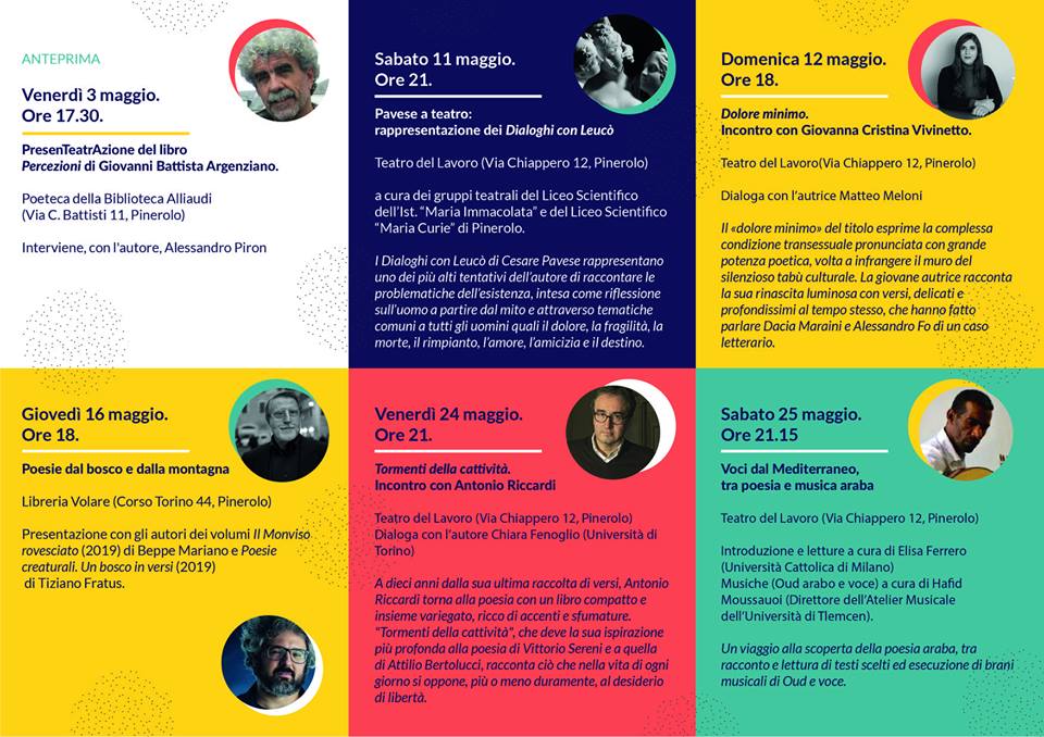 Due occasioni di incontro coi lettori per Poesie creaturali al Salone del Libro di Torino: giovedì 9 maggio al Giardino dell’ex Circoscrizione 8 di Torino (ore 17) e giovedì 16 maggio alla Libreria Volare di Pinerolo (ore 18).