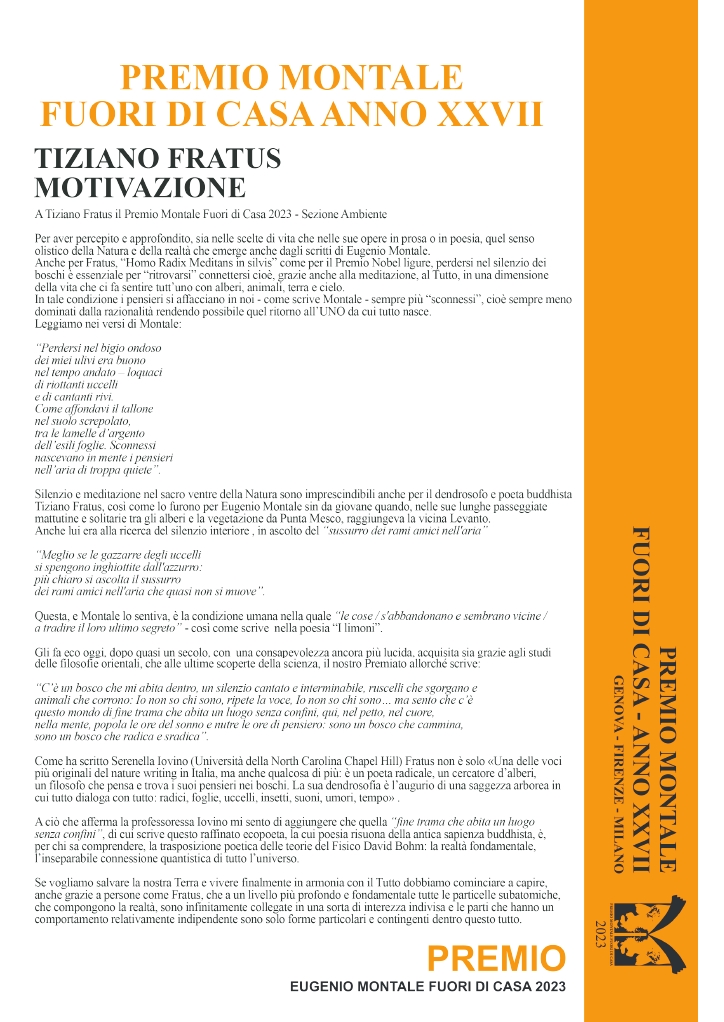 Per aver percepito e approfondito, sia nelle scelte di vita che nelle sue opere in prosa o in poesia, quel senso olistico della Natura e della realtà che emerge anche dagli scritti di Eugenio Montale. Anche per Fratus, “Homo Radix Meditans in silvis” come per il Premio Nobel ligure, perdersi nel silenzio dei boschi è essenziale per “ritrovarsi” connettersi cioè, grazie anche alla meditazione, al Tutto, in una dimensione della vita che ci fa sentire tutt’uno con alberi, animali, terra e cielo. In tale condizione i pensieri si affacciano in noi – come scrive Montale – sempre più “sconnessi”, cioè sempre meno dominati dalla razionalità rendendo possibile quel ritorno all’UNO da cui tutto nasce.