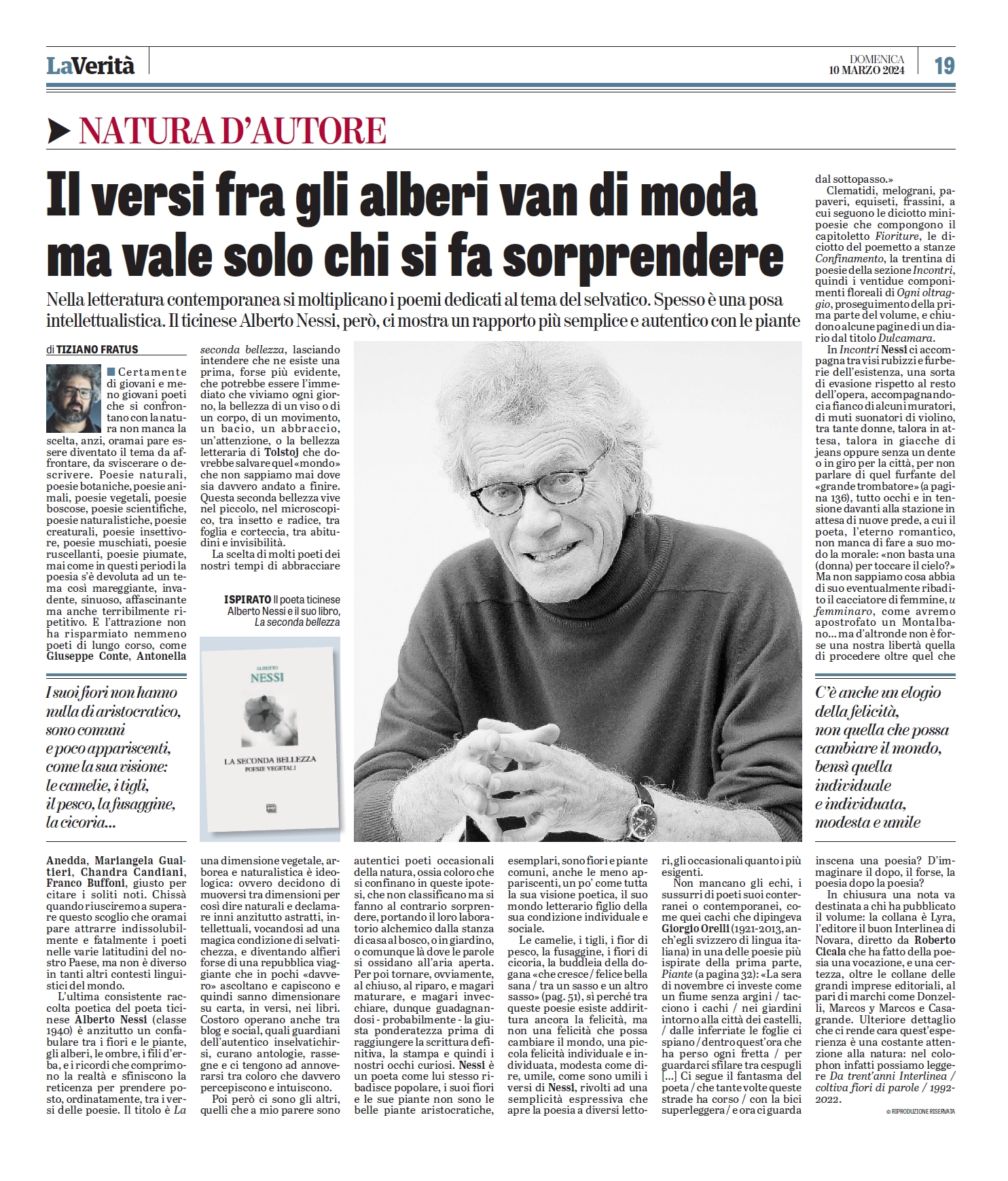 I versi fra gli alberi van di moda ma vale solo chi si fa sorprendere – Soggetti: tanti poeti parlano di natura e di fiori ma poi c’è La seconda bellezza di Alberto Nessi (Interlinea) – Leggi l’articolo