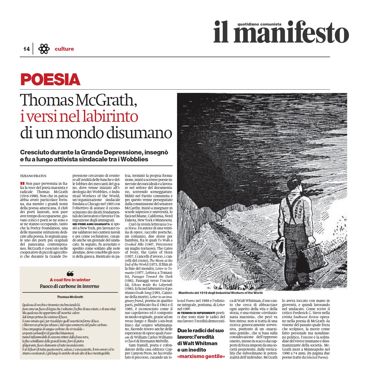 TF – Una sorpresa è stata la lirica di Thomas McGrath (1916-1990), figura in Italia appena-appena pervenuta nella sola antologia Nuova Poesia Americana. Los Angeles (a cura di L. Ballerini e P. Vangelisti, Mondadori), ma per me pietra focaia di costante paragone e ispirazione. La sua poesia è pubblicata in due volumi negli Stati Uniti dalla Copper Canyon Press, mecca per gli appassionati di poesia, co-fondata da Sam Hamill. A McGrath si deve una delle più commoventi definizioni di arte e poesia, che egli rilasciò quando fu chiamato, nel 1953, a occupare la scomoda seggiola degli imputati di collaborazionismo col comunismo e l’Unione Sovietica, ai tempi della caccia alle streghe volute dal senatore McCarthy: «In qualità di poeta devo rifiutare di cooperare con la commissione su quelle che posso soltanto chiamare considerazioni estetiche. La visione della vita che riceviamo attraverso la grande opera dell’arte è un privilegio – è una visione della vita in accordo con probabilità e necessità, non soggetta alla scelta e al caso imposti dalle nostre esistenze reali, tuttavia in un senso più concreto rispetto a quel che riconosciamo intorno a noi.» Sui temi della poesia di questo poeta immigrato inizia ad essere stato scritto molto, ma valga quel che «The Washington Post» annunciò nel necrologio: «Marxist poet Thomas McGrath died on Sep 19, 1990 at the age of 73», ossia «poeta marxista.» Per altri critici ha incarnato la figura del poeta “radicale”. Cresciuto nella vasta provincia delle cooperative agricole che cercavano di contrastare banche e lobbies, è stato saldatore ai cantieri navali e sindacalista a New York, ha combattuto nella seconda guerra mondiale e rientrato negli Stati Uniti ha lavorato nel settore della sceneggiatura per documentari. McGrath è autore di varie raccolte di poesia, di romanzi e storie per bambini, e di un vastissimo poema postmoderno, Letter to an Imaginary Friend, che lo ha impegnato per oltre trent’anni. Ho dedicato alcuni scritti a questo poesta americano, segnalo un articolo uscito sulle pagine de Il Manifesto: «Nella poesia di Tom McGrath c’è attenzione per la condizione degli uomini e delle creature, si avvicina a quella che in quanto figlio della terra, della grande pianura padana e dei territori prealpini, percepisco intimamente e prossima. Uno sguardo che non lascia niente indietro o da parte.»
