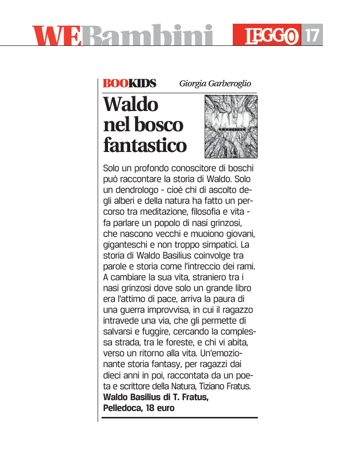 «Uno strano popolo che vive alla rovescia – Parlano al contrario, nascono saggi e invecchiano incoscienti. Sono i protagonisti del libro Waldo Basilius (Pelledoca editore) di Tiziano Fratus, illustrazioni di Emanuele Giacopetti, per bambini dagli 11 anni» La Repubblica